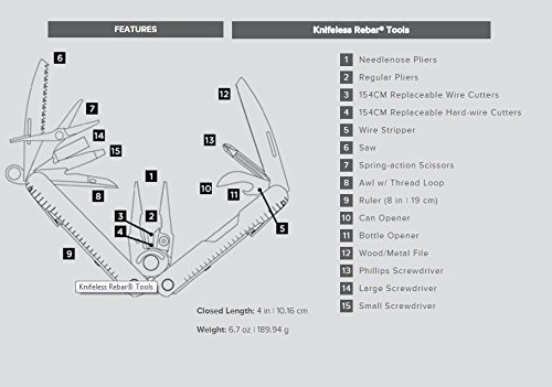 Specification: LEATHERMAN – Rebar Knifeless, kompaktes Multi-Tool mit 16 wichtigen Werkzeugen, ohne Messerklinge, mit Leder Holster