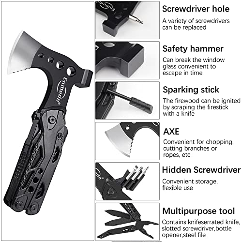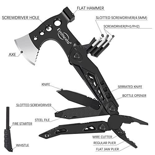 【Militärische Qualität, starke Leistung】 Multitool Axt und Hammer ist mit premium,Functional Zubehör Material 3cr13 MartensiticSteel, Axt Kopf und Hammer Kopf Material ist 420# Edelstahl, Griff Material ist Aluminium-Legierung, hohe Festigkeit, hohe Zähigkeit, Korrosionsbeständigkeit.so kann es Holz schneiden, Glas brechen, und helfen Sie überleben jede Notsituation