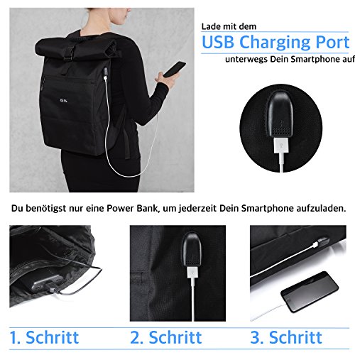 DURCHDACHTES DESIGN: Mit gepolstertem Fach für Notebooks bis zu 17” Zoll und DINA4 Ordner, einem USB Anschluss zum Aufladen Deines Smartphones während Du unterwegs bist, einem Flaschenhalter, damit Du nicht mehr vergisst, ausreichend zu Trinken, praktischen Innentaschen für Stifte, Kopfhörer, Snacks und einem Geheimfach für Wertsachen.