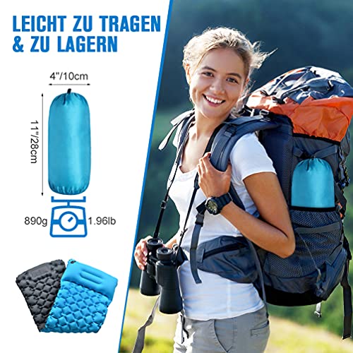 【Upgraded Inflation & deflation system】Um ein besseres Nutzungserlebnis zu bieten, sind die Inflationspumpe und das Deflationsventil anders positioniert, um Luftlecks zu vermeiden und eine schnellere Deflation zu erreichen. Die Schlafmatte misst 79 × 28 × 3inch nach dem Aufblasen und 11 × 4,7 × 4inch nach dem kleines isomatte Falten , und wiegt etwa 1.96lb, geeignet für Camping, Zelt, Wandern, Rucksacktourismus, etc