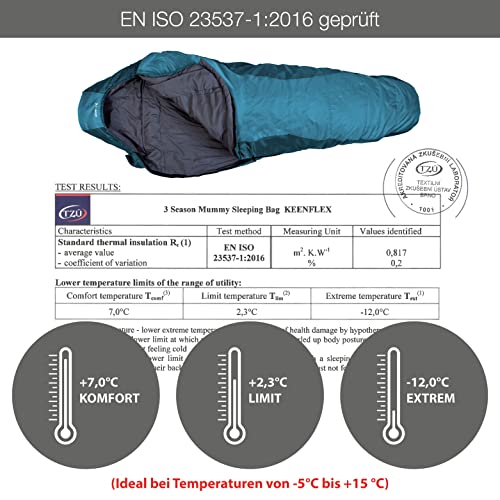 Der KEENFLEX – Mumienschlafsack wurde im Labor gemäß den neuesten globalen Standards (EN ISO 23537-1: 2016) mit einer zertifizierten Extremtemperatur von -12,0°C und einem Schlafkomfort ab 7,0 °C getestet. Perfekt für Frühlings-, Sommer- und Herbstcamping.