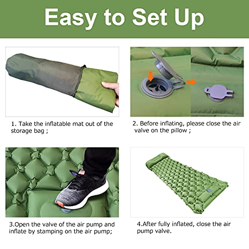 ⛺【30s Stampfen zum Aufblasen & 3s Entlüften】Mit einer verbesserten Schnellaufblaspumpe kann die Camping-Isolierunterlage durch Fuß- oder Handdruck aufgeblasen werden. Sie müssen nur 30 Sekunden lang auf die eingebaute Luftpumpe an der Unterseite der Isomatte stampfen, um sie aufzublasen, und den aufblasbaren Stopfen am Kissen öffnen, um 3 Sekunden lang eine superschnelle Entleerung zu erreichen.
