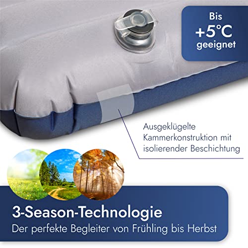 🌄VON FRÜHLING BIS HERBST: Durch die ausgeklügelte Kammerkonstruktion mit isolierender Beschichtung erreicht die Isomatte einen R-Wert von 3. Somit hält sie dich bei Temperaturen bis + 5 °C angenehm warm.