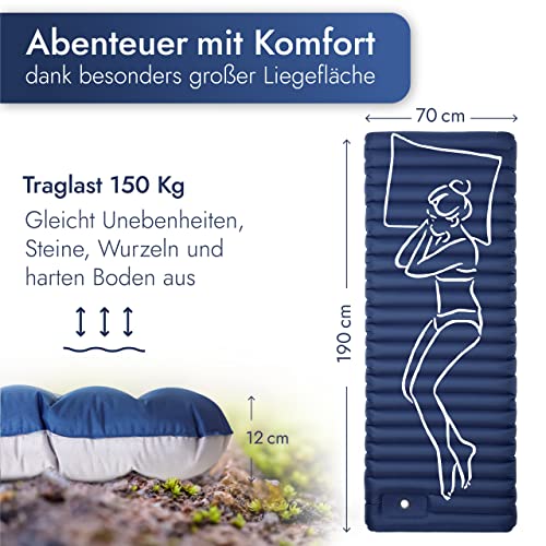 🌄HÖCHSTER SCHLAFKOMFORT: Mit einer Länge von 190 cm und Breite von 70 cm bietet die Isomatte auch für große Menschen reichlich Platz. Aufgrund ihrer Höhe von 12 cm schlafen selbst Seitenschläfer wie auf Wolken.