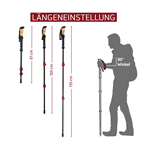 EINFACHE HANDHABUNG – zusammengeschoben sind die Stöcke 61cm lang und passen bequem an Ihren Rucksack. Die Längeneinstellung ist einfach und dauert nur wenige Sekunden.