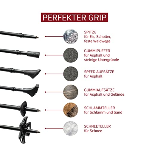 FLEXIBEL – die Stöcke lassen sich auf 105-135cm einstellen und sind für Körpergrößen zwischen 1,55m und 1,95m geeignet. Dank der Griffverlängerung müssen Sie bei kurzen Anstiegen die Länge nicht jedes Mal verstellen.