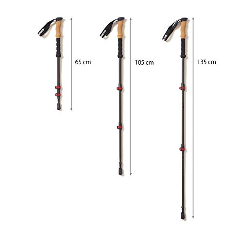 STUFENLOS JUSTIERBAR: Schnelle Längeneinstellung durch Quick-Lock System aus Aluminium. Mithilfe aufgedruckter Zentimeter Skalierung lassen sich die Wanderstöcke individuell auf jede Länge zwischen 65 cm bis 135 cm einstellen und zuverlässig befestigen