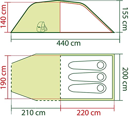 Größe Trekkingzelt aufgebaut: 4,4 x 1,9 x 1,5 m (L x B x H); Schlafkabine: 4,2 m² und Wohnbereich: 3,8 m² = 8 m²; Packmaß: 66 x 18 x 18 cm; Gewicht: 7,2 kg; Inkl. Tragetasche, Abspannseile und ausreichend Zeltheringe