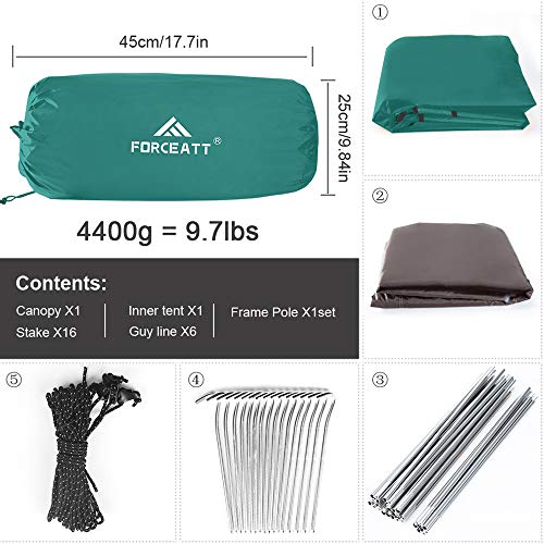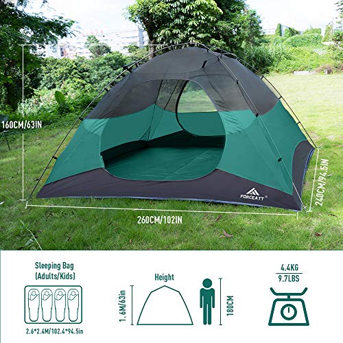 【LEICHT UND KOMFORTABEL】 Die Innengröße des Forceatt-Campingzeltes beträgt 102 * 94.5 * 63in (260 * 240 * 160cm) und bietet Platz für vier Personen gleichzeitig. Gleichzeitig hat es eine Packungsgröße von 17.7 * 9.84in(45 *25in) und wiegt 9.7lbs(4.4KG), was Platz spart und leicht zu transportieren ist.